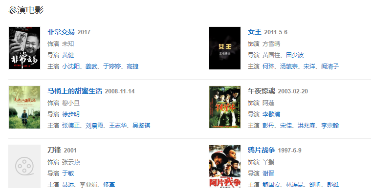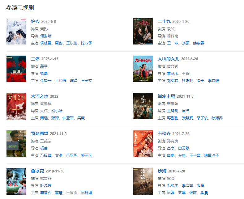 代表作品:美人為餡、情定三生、美人制造、沙海、少年包青天Ⅲ之天芒傳奇、笑傲江湖、陸貞傳奇、千金女賊