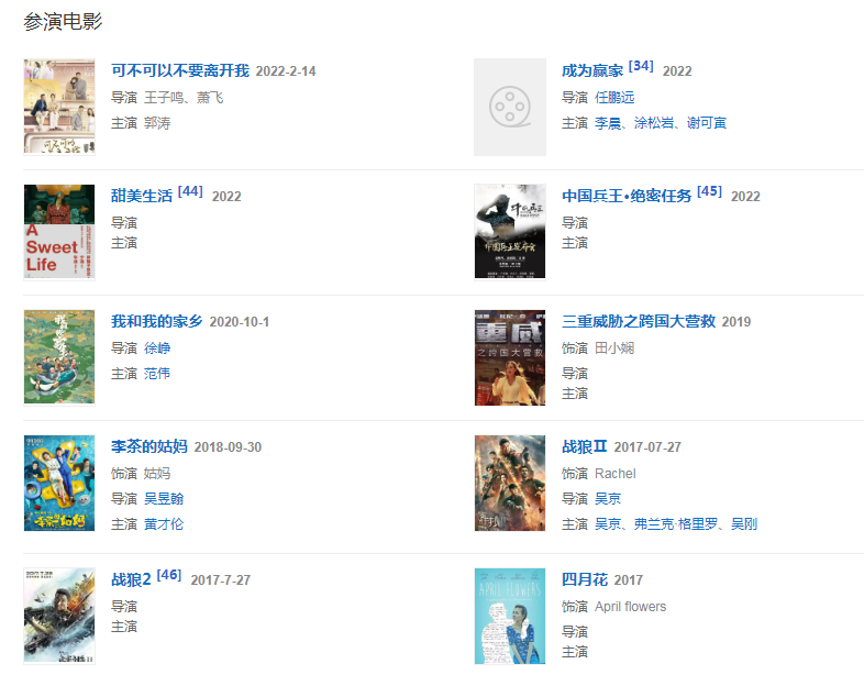 代表作品:戰(zhàn)狼Ⅱ、李茶的姑媽、狼牙、綠箭俠、你的今天和我的明天