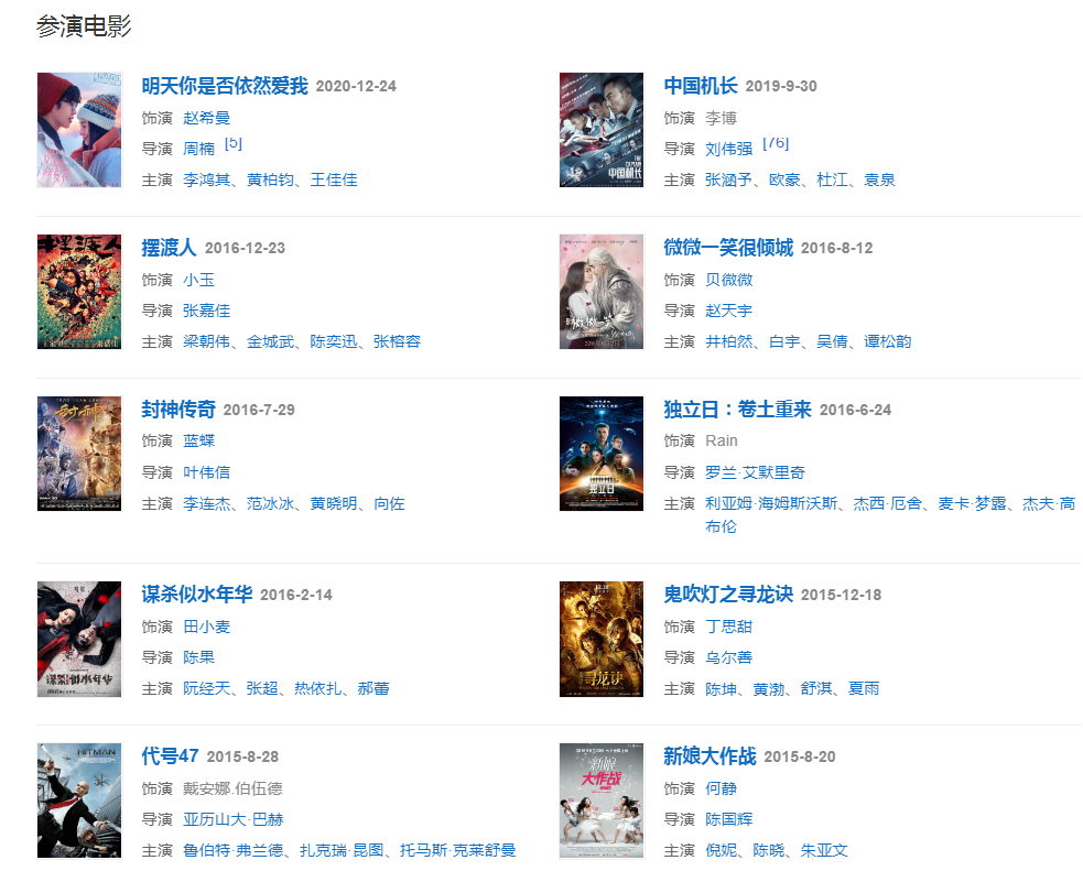 2020年,主演愛(ài)情片《明天你是否依然愛(ài)我》;同年,第八次入選福布斯中國(guó)名人榜,并位列第16位。