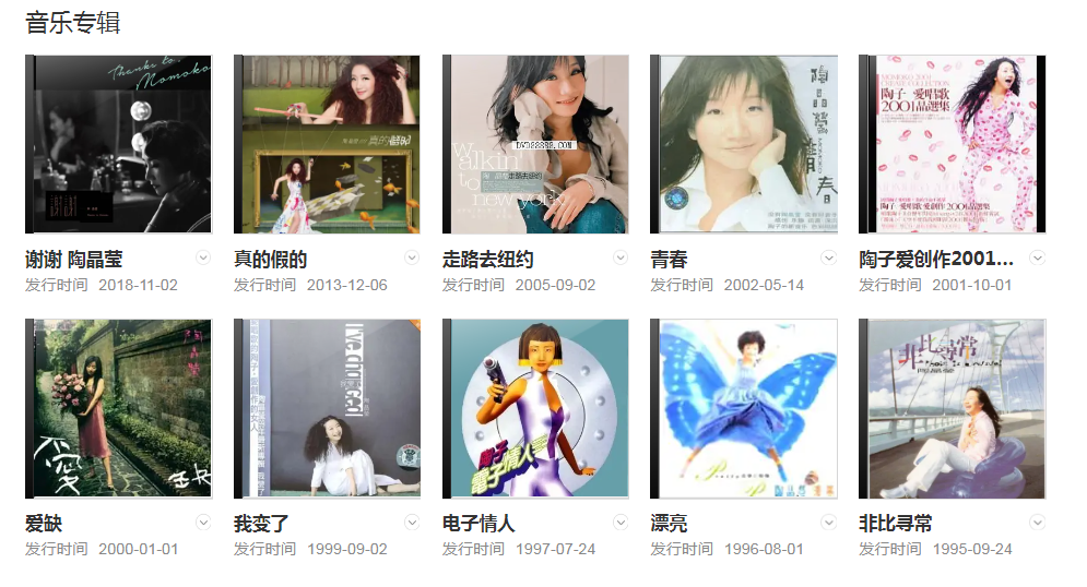 代表作品:太委屈、姐姐妹妹站起來、離開我、真的假的、走路去紐約、陶子藝言堂、娛樂新聞