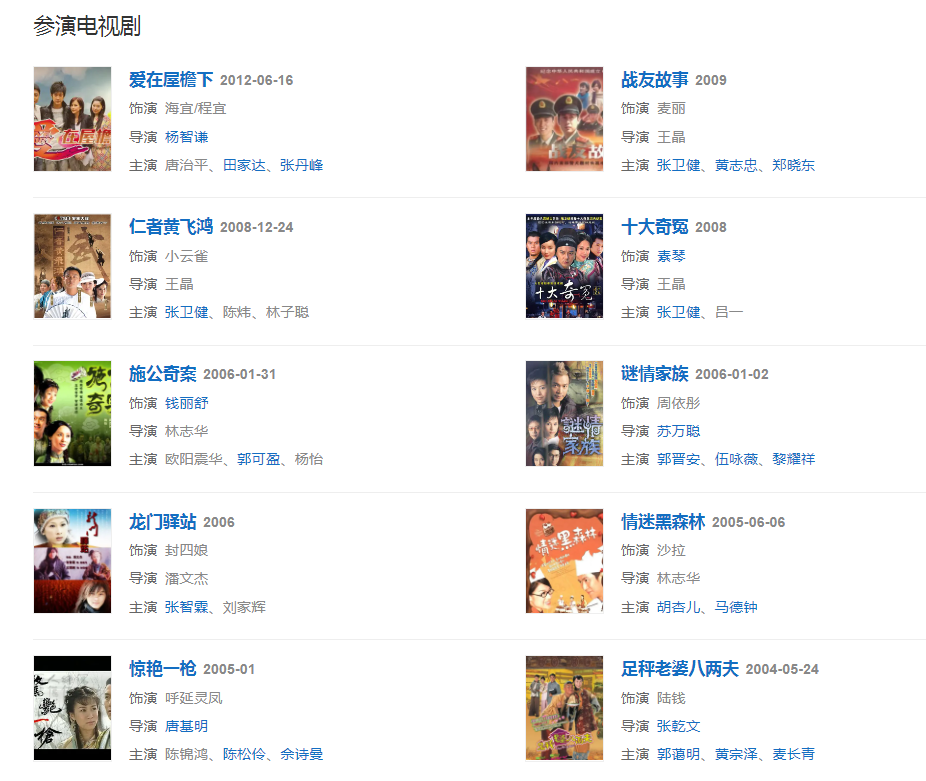 代表作品:錦繡良緣、愛在屋檐下、談判專家、天子尋龍、仁者黃飛鴻、足秤老婆八兩夫、謎情家族
